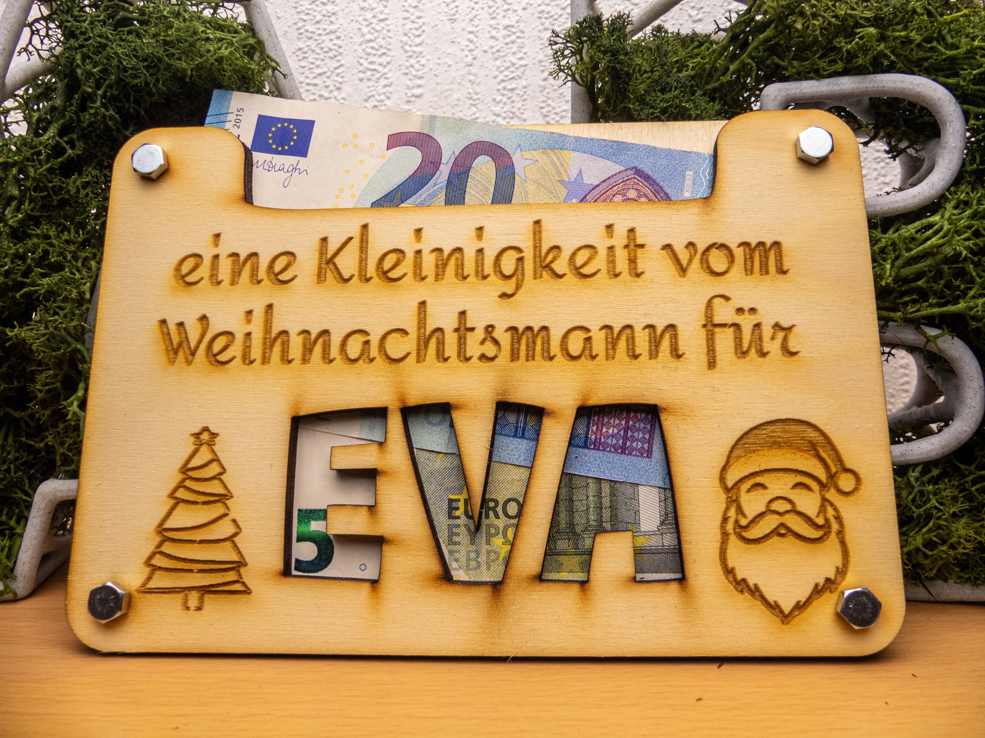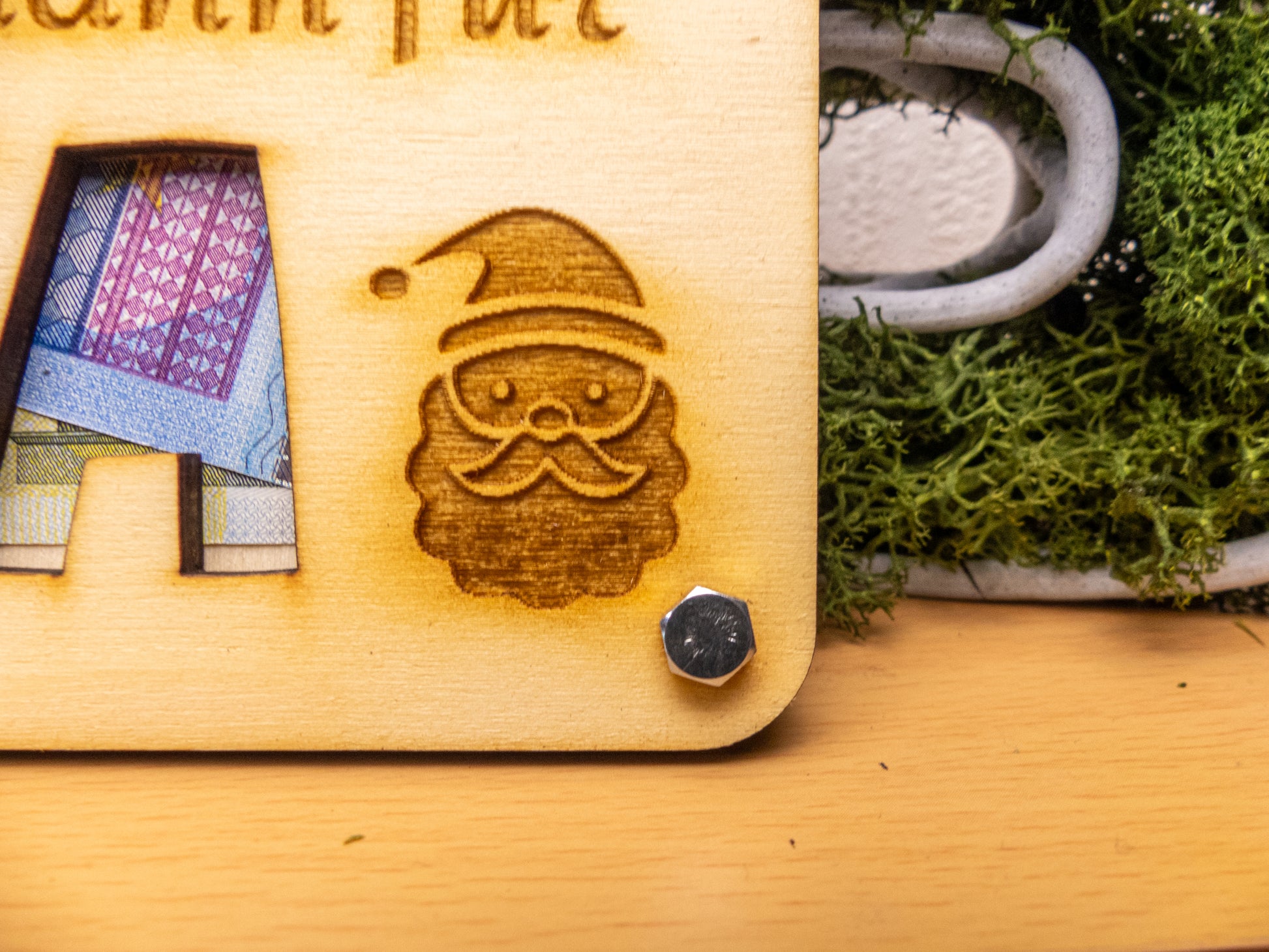 Weihnachten steht vor der Tür, und die magische Zeit des Schenkens rückt näher! Wenn du noch auf der Suche nach einem Geschenk bist, das nicht nur persönlich, sondern auch sinnvoll ist, haben wir genau das Richtige für dich. Unsere individuell gestaltbaren Geldgeschenkkarten bieten eine festliche und kreative Möglichkeit, Geld stilvoll zu verschenken. Statt es in einem gewöhnlichen Umschlag zu überreichen, kannst du dein Geschenk elegant zwischen zwei edlen Holzplatten verpacken – ein besonderes Präsent, das die Herzen höher schlagen lässt und garantiert in Erinnerung bleibt.