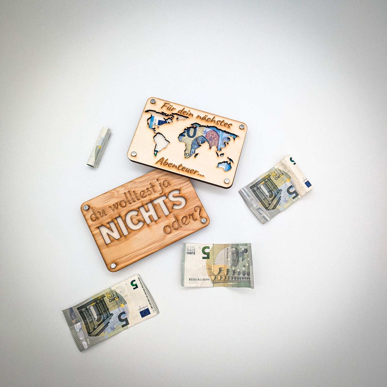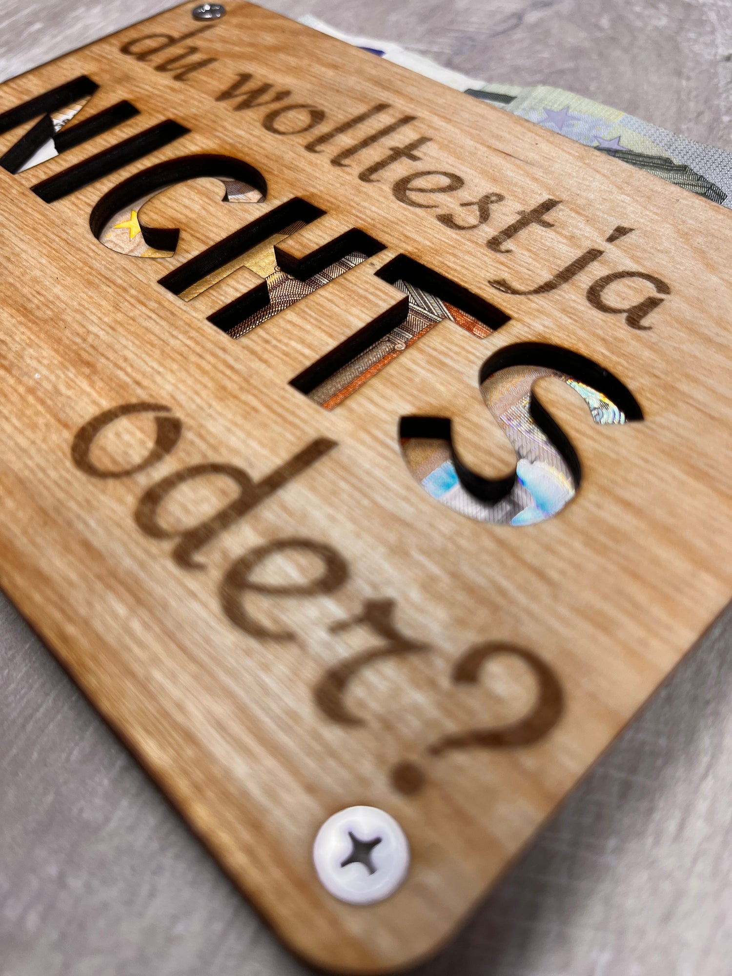 Das Set besteht aus sorgfältig verarbeitetem, langlebigem Holz, das durch seine glatte Oberfläche und präzise Auslassungen besticht. Die stabilen Schrauben sorgen dafür, dass die Geldscheine sicher an Ort und Stelle bleiben, ohne das edle Design zu beeinträchtigen. So vereint dieses Geschenk eine humorvolle Idee mit einem eleganten Look.